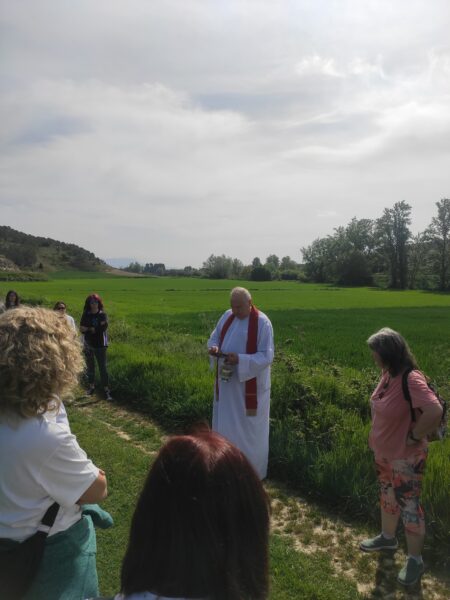 Cerca de medio centenar de vecinos se animaron a hacer el recorrido andando hasta la Ermita de Junquera, pero esta vez no por la carretera, sino atravesando los campos. El paseo, con una temperatura muy agradable y sin exceso de sol, acompañó desde el inicio, haciendo del trayecto parte importante del día. Durante el camino tuvo lugar también la bendición de los campos, manteniendo así una de las esencias de esta celebración.