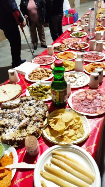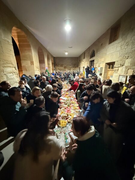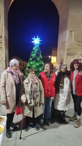 Tras el encendido, llegó uno de los momentos más esperados: el almuerzo ofrecido por Cruz Roja dentro del programa Vincúlate. Bajo los soportales de piedra, una gran mesa repleta de dulces, bocados caseros y conversaciones alegres reunió a decenas de personas. En las fotos queda reflejado: la plaza vibrando de vida, generaciones mezcladas, abrazos reencontrados, risas que se escapaban entre bufandas y gorros, y la luz del árbol presidiendo la escena como un faro verde de esperanza.