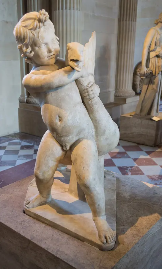 Está basada en una escultura histórica que se calcula que es sobre el siglo II a.C., perteneciente al arte griego. Aunque la escultura original estaba hecha de bronce ha llegado a la actualidad por varias copias romanas, entre ellas una que se conserva en el Louvre de París: